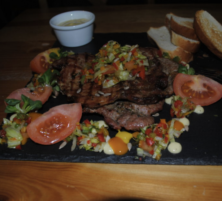 polana masełkiem ziołowym podawana z frytkami lub łódeczkami oraz dodatkiem do wyboru (sałatka colesław, sałatka szwedzka, ogórek kiszony)
